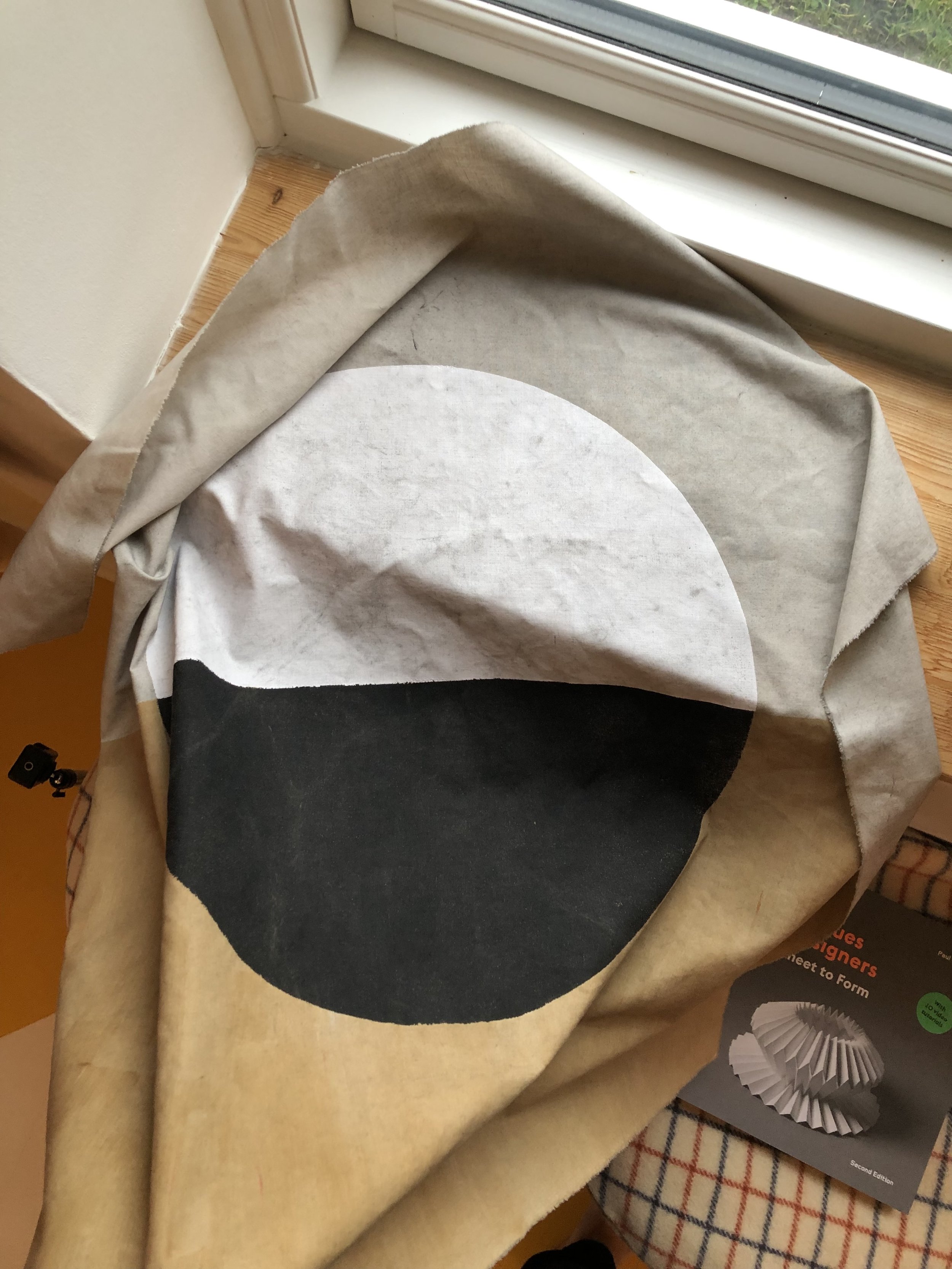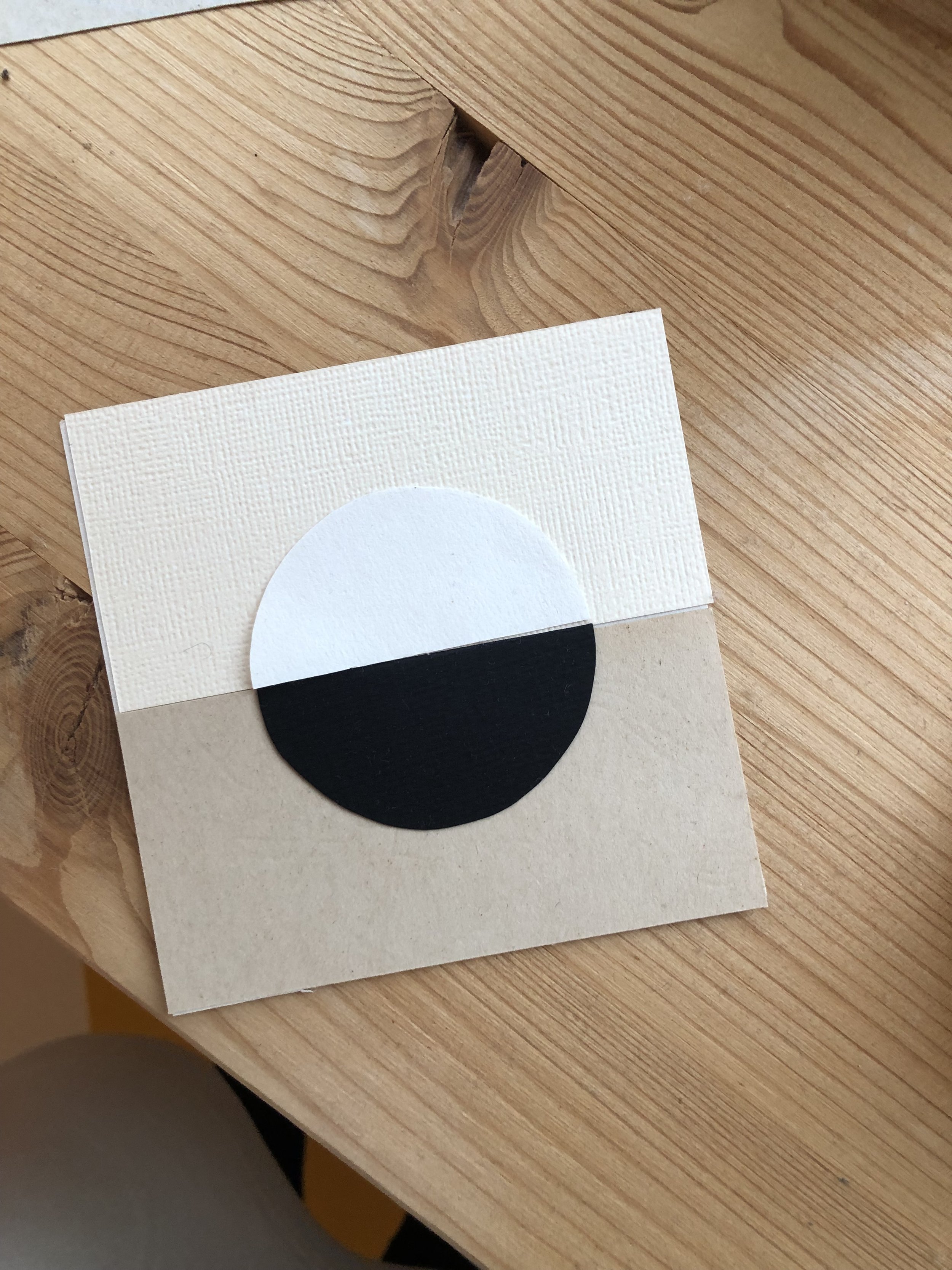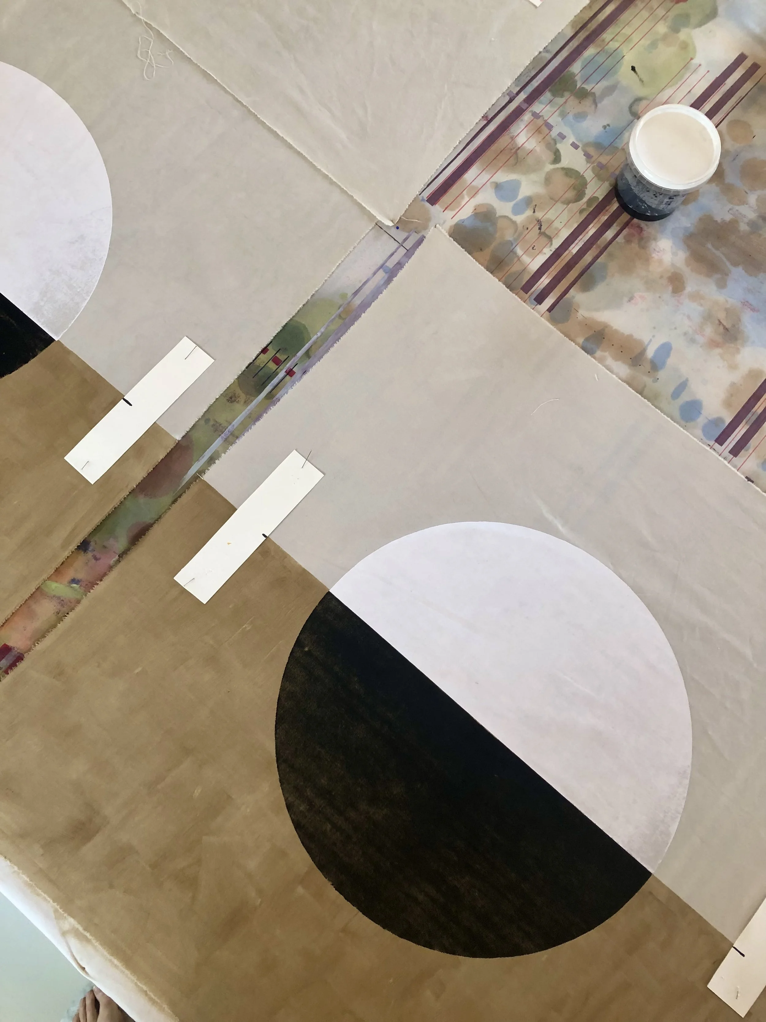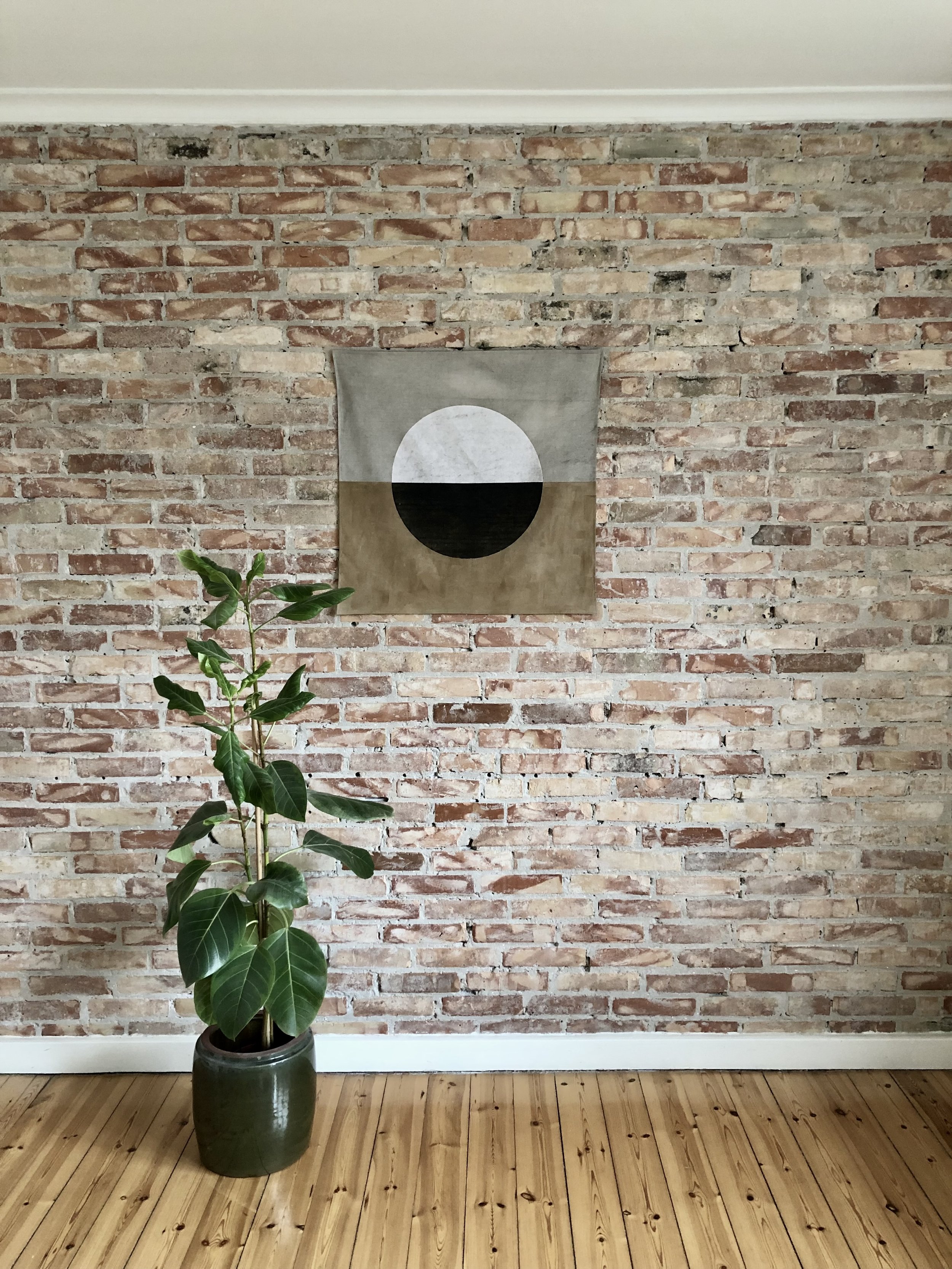 MÅNESOL blev lavet i samarbejde med Sille fra spiseriet Patio 34 i Helsingør. Sille skrev til mig og spurgte om jeg lavede værker på bestilling efter ønske af farver. Hun var på udkig efter et værk til deres café, som de var i gang med at indrette i en japansk inspireret stil. Det var SOL I FARVER hun var faldet over, men hun ønskede en mere dæmpet farvepalette i jordnære nuancer som beige, brun, sort og hvid. Så det fik hun.