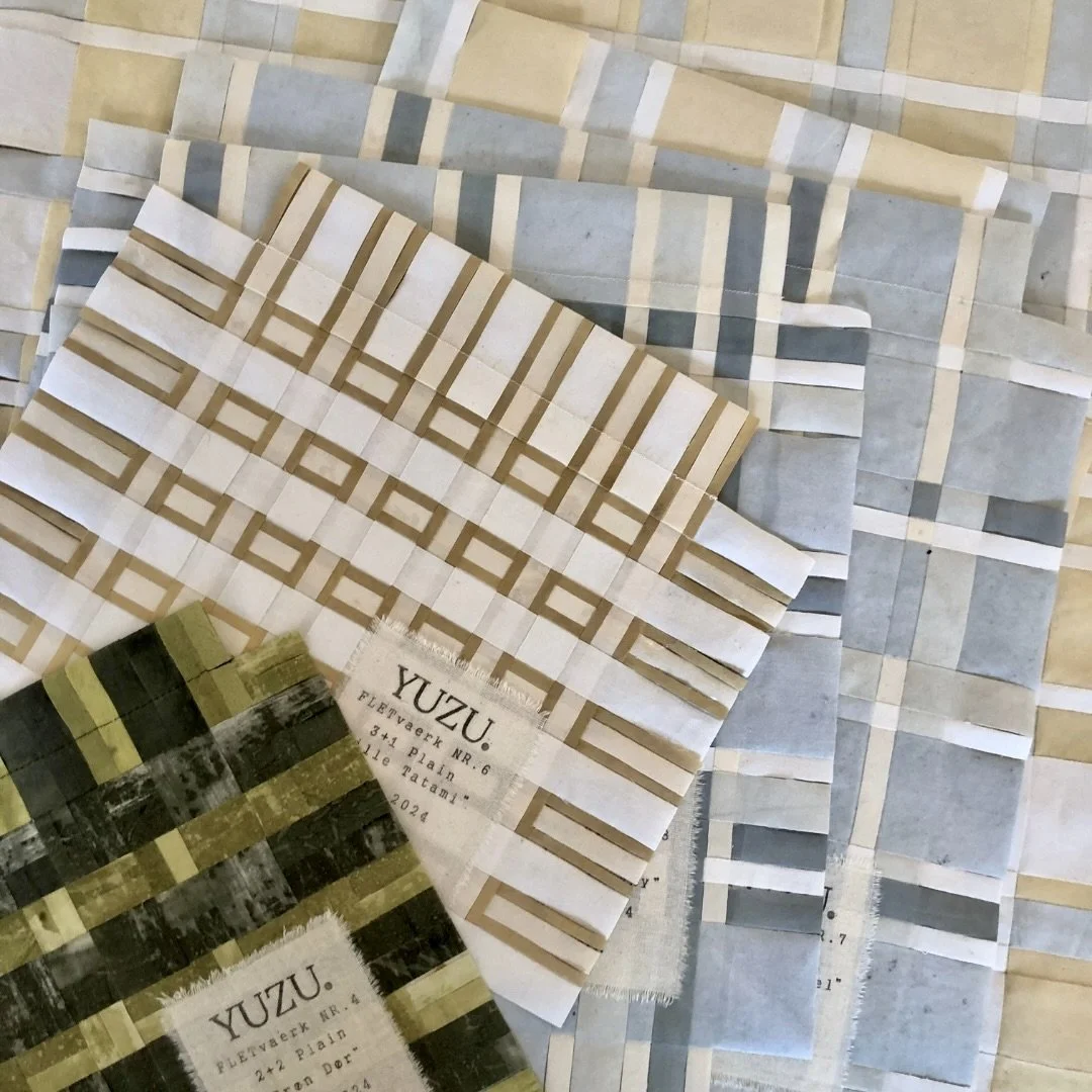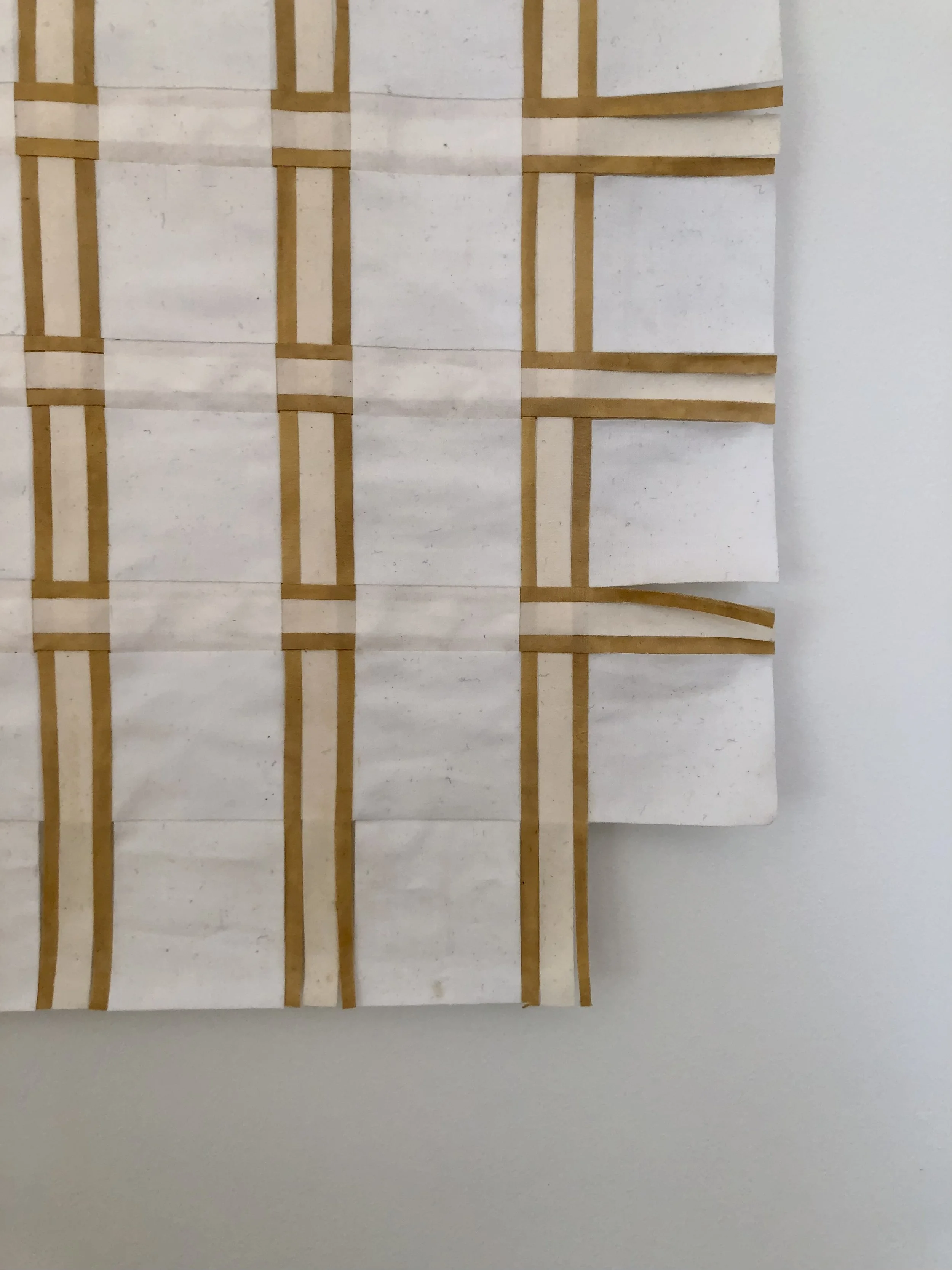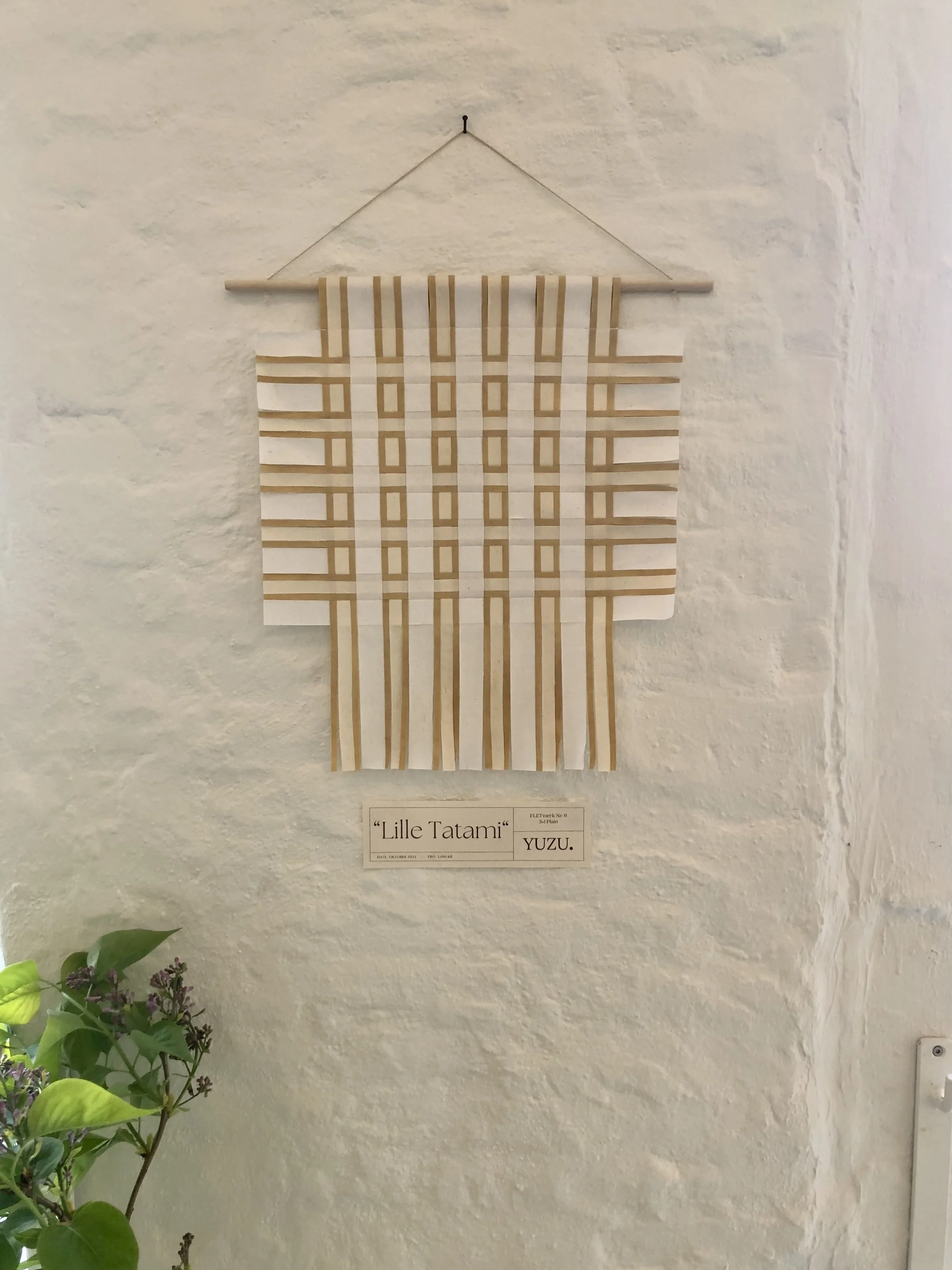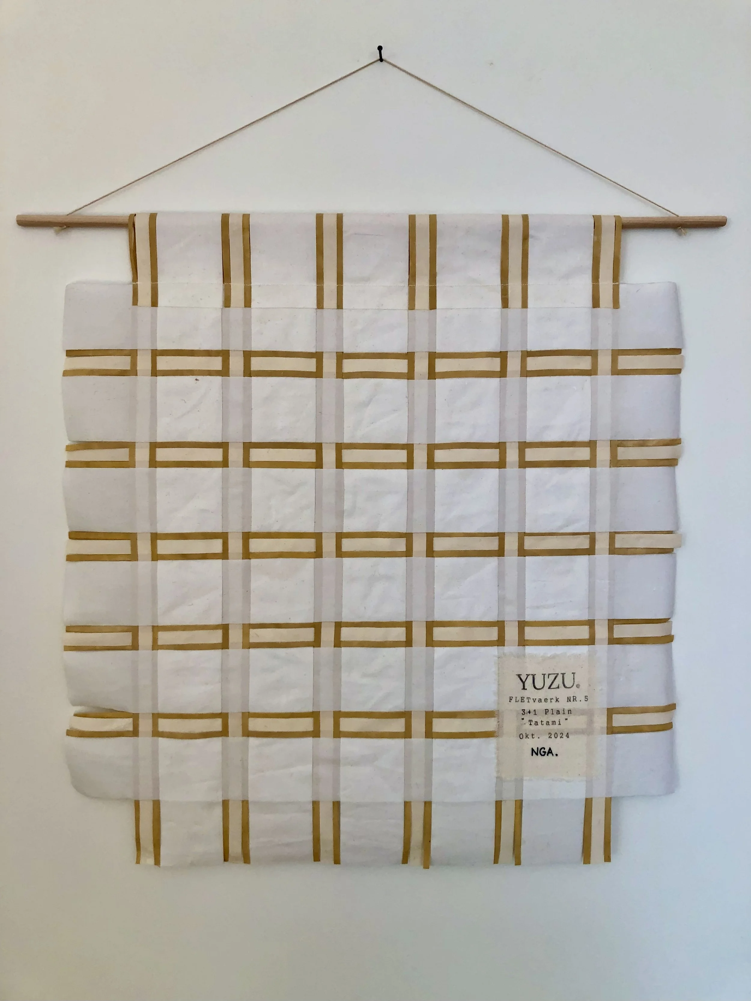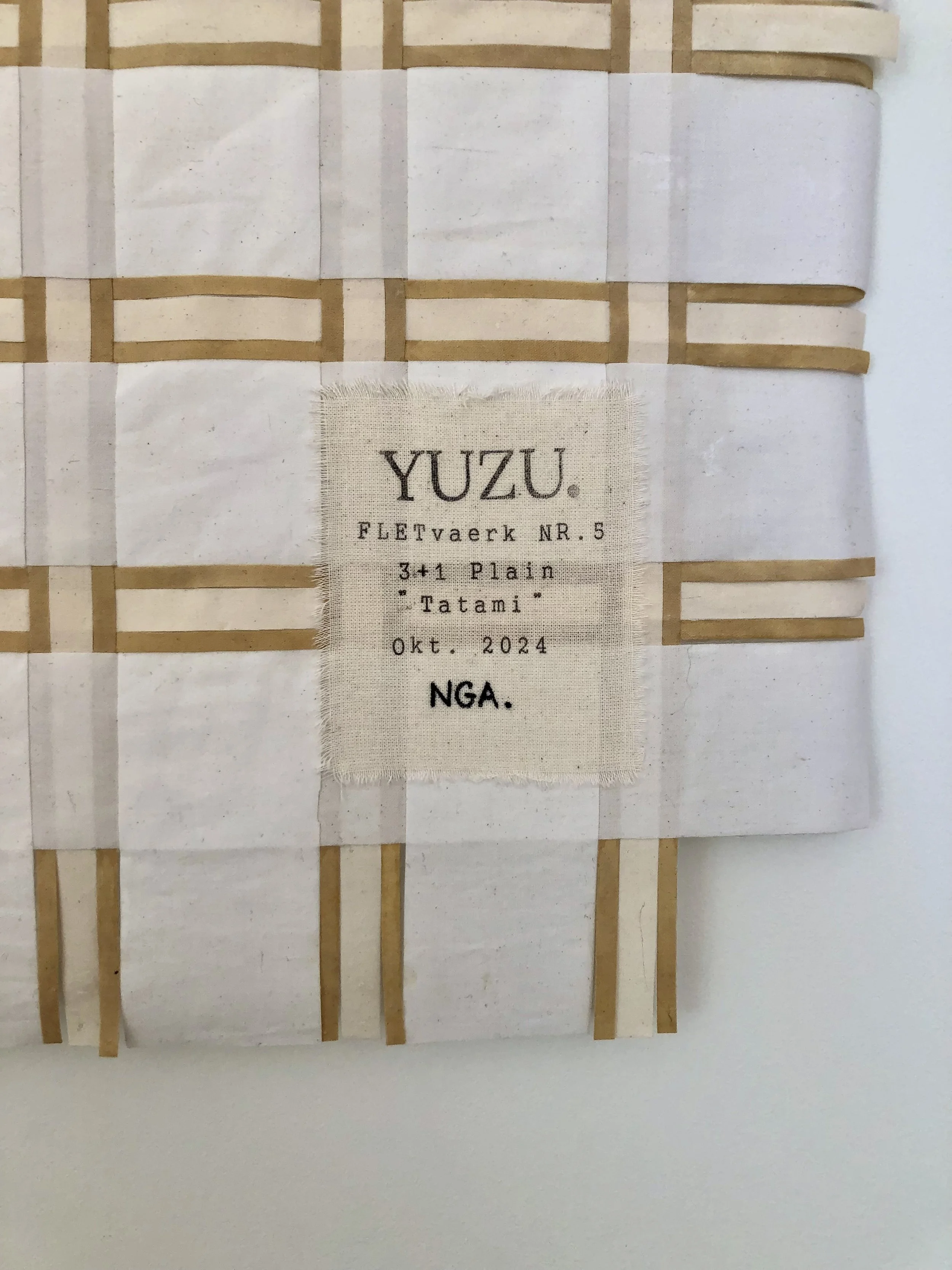 TATAMI (og LILLIE TATAMI) blev til i en leg med tekstile strimler. En del af processen med at skabe fletværkerne har været at undersøge forskellige flette/væve mønstre, og hvordan farverne og de varierende strimmel-tykkelser har harmoneret, påvirket og interageret med hinanden herigennem. Til at starte med var 1 cm den smalleste strimmel jeg arbejde med, men som TATAMI udviklede sig i mine hænder, måtte jeg halvere den mørke, varme karryfarve, fremskabt fra gule løgskaller, som jeg havde indfarvet det hvide tekstil med, for at få det udtryk frem, som begyndte at vise sig, og som mindende mig om gulvene i japanske huse belagt med smukke tatami måtter i enkle, grafiske mønstre.