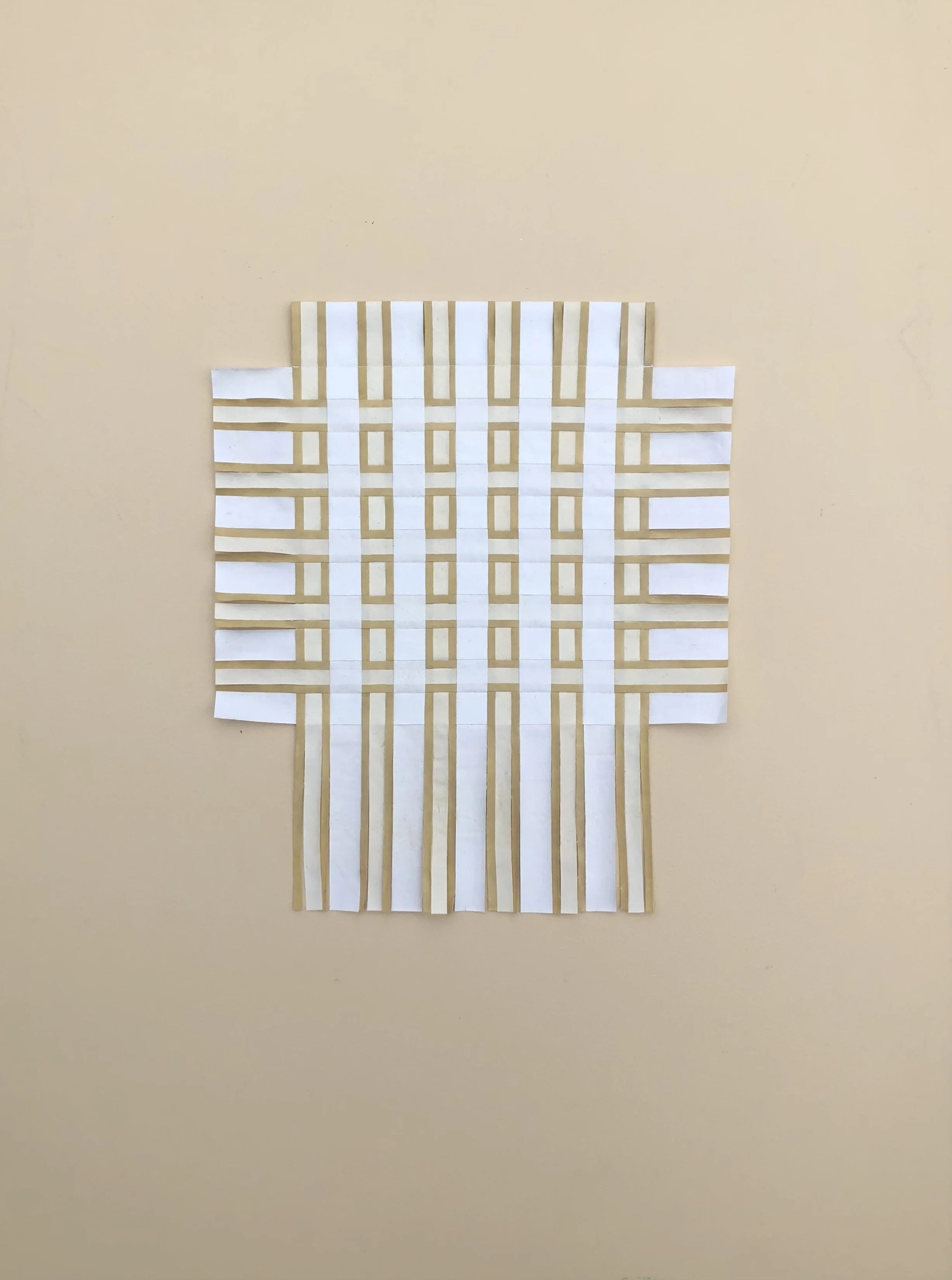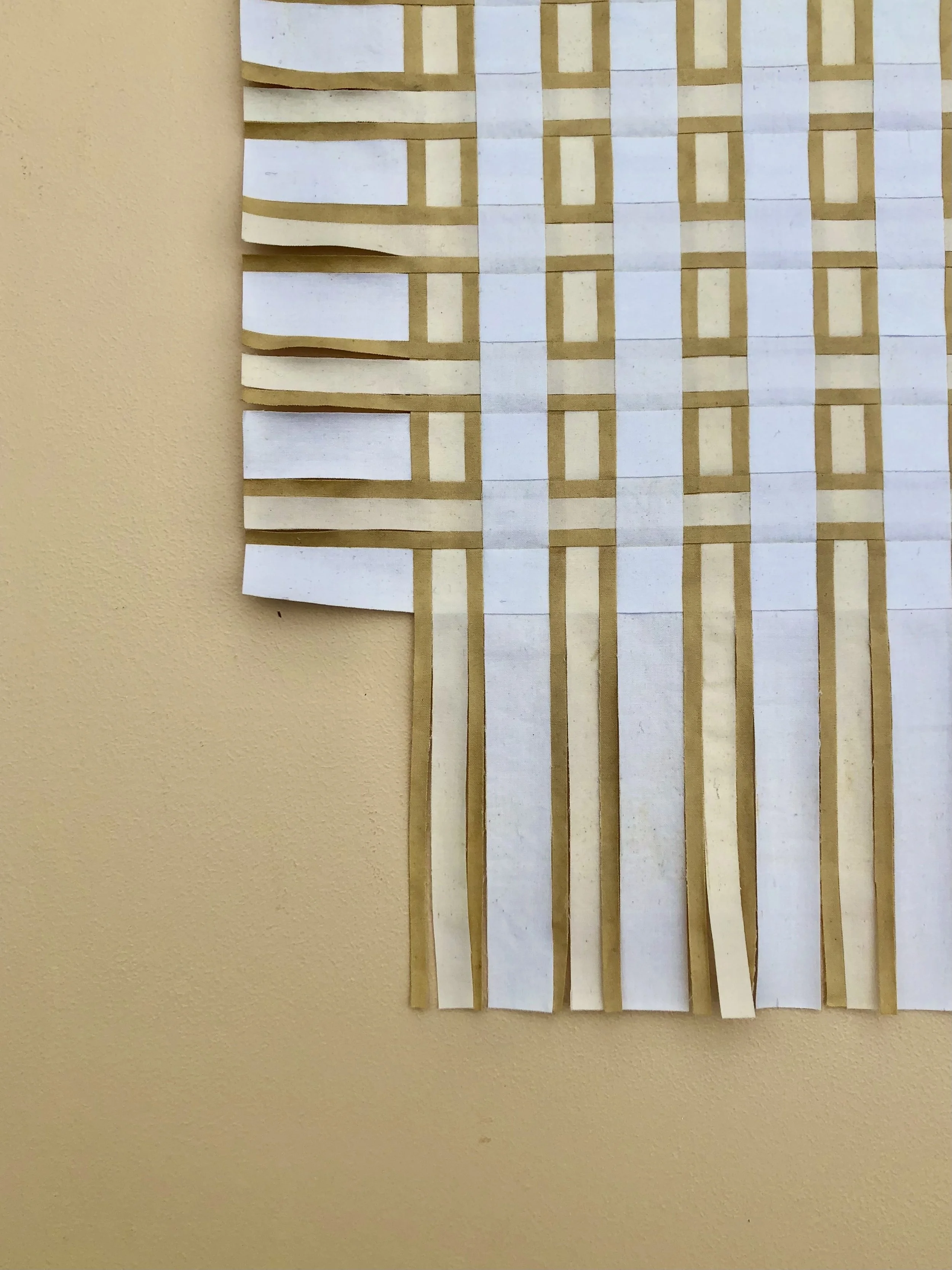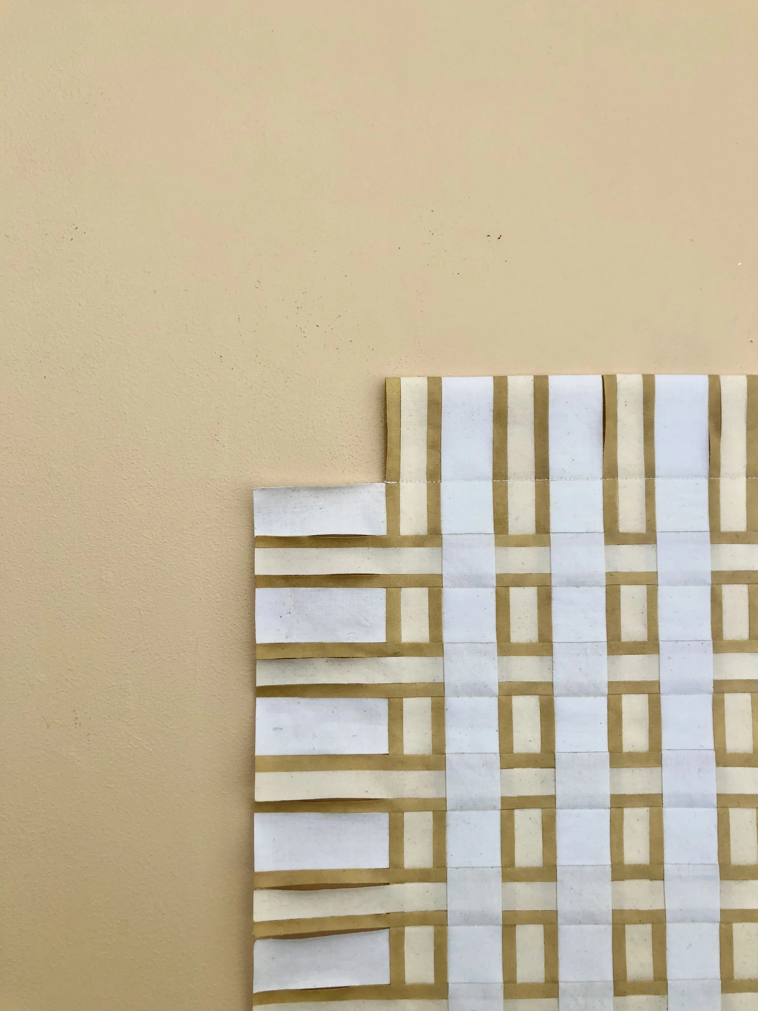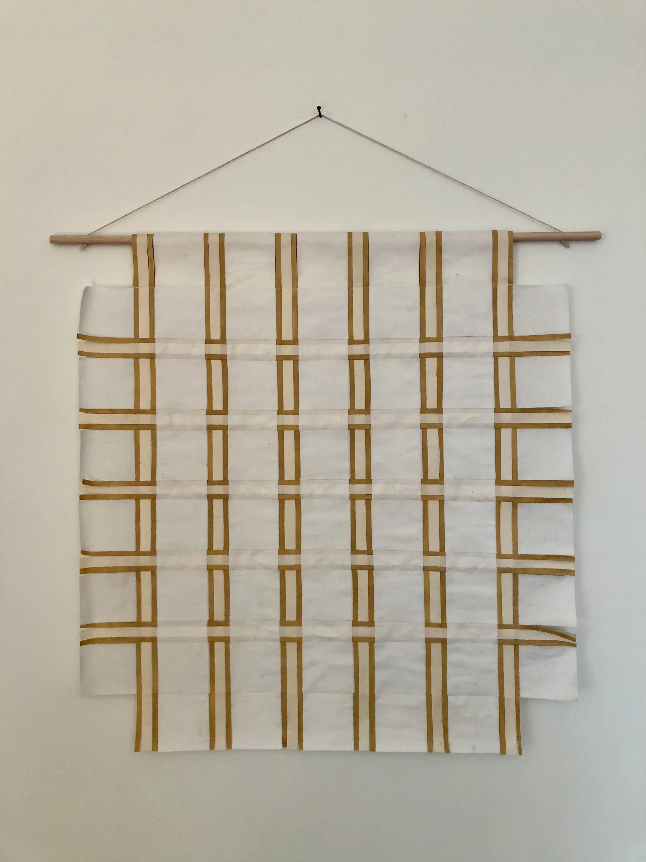 TATAMI (og LILLIE TATAMI) blev til i en leg med tekstile strimler. En del af processen med at skabe fletværkerne har været at undersøge forskellige flette/væve mønstre, og hvordan farverne og de varierende strimmel-tykkelser har harmoneret, påvirket og interageret med hinanden herigennem. Til at starte med var 1 cm den smalleste strimmel jeg arbejde med, men som TATAMI udviklede sig i mine hænder, måtte jeg halvere den mørke, varme karryfarve, fremskabt fra gule løgskaller, som jeg havde indfarvet det hvide tekstil med, for at få det udtryk frem, som begyndte at vise sig, og som mindende mig om gulvene i japanske huse belagt med smukke tatami måtter i enkle, grafiske mønstre.