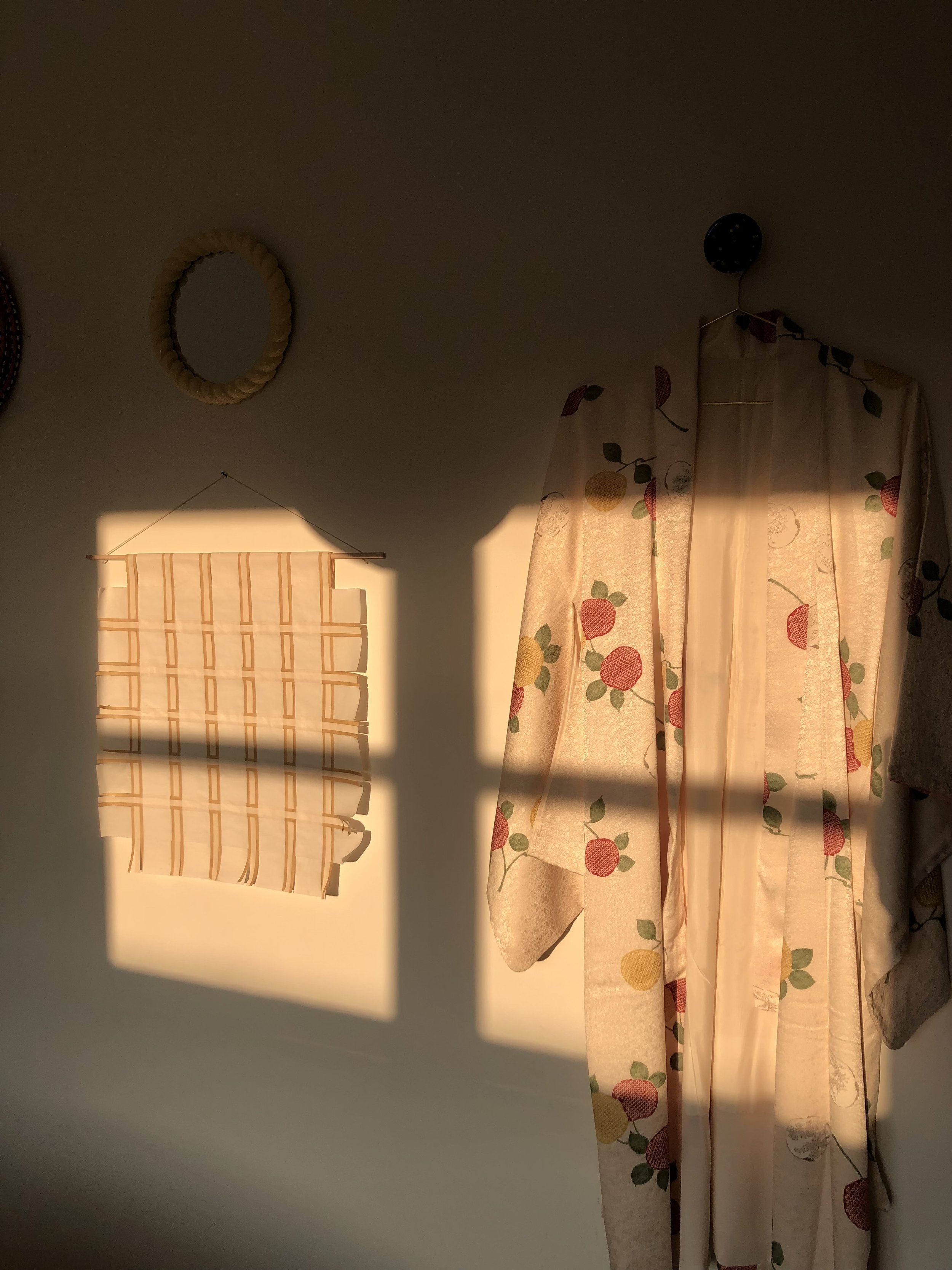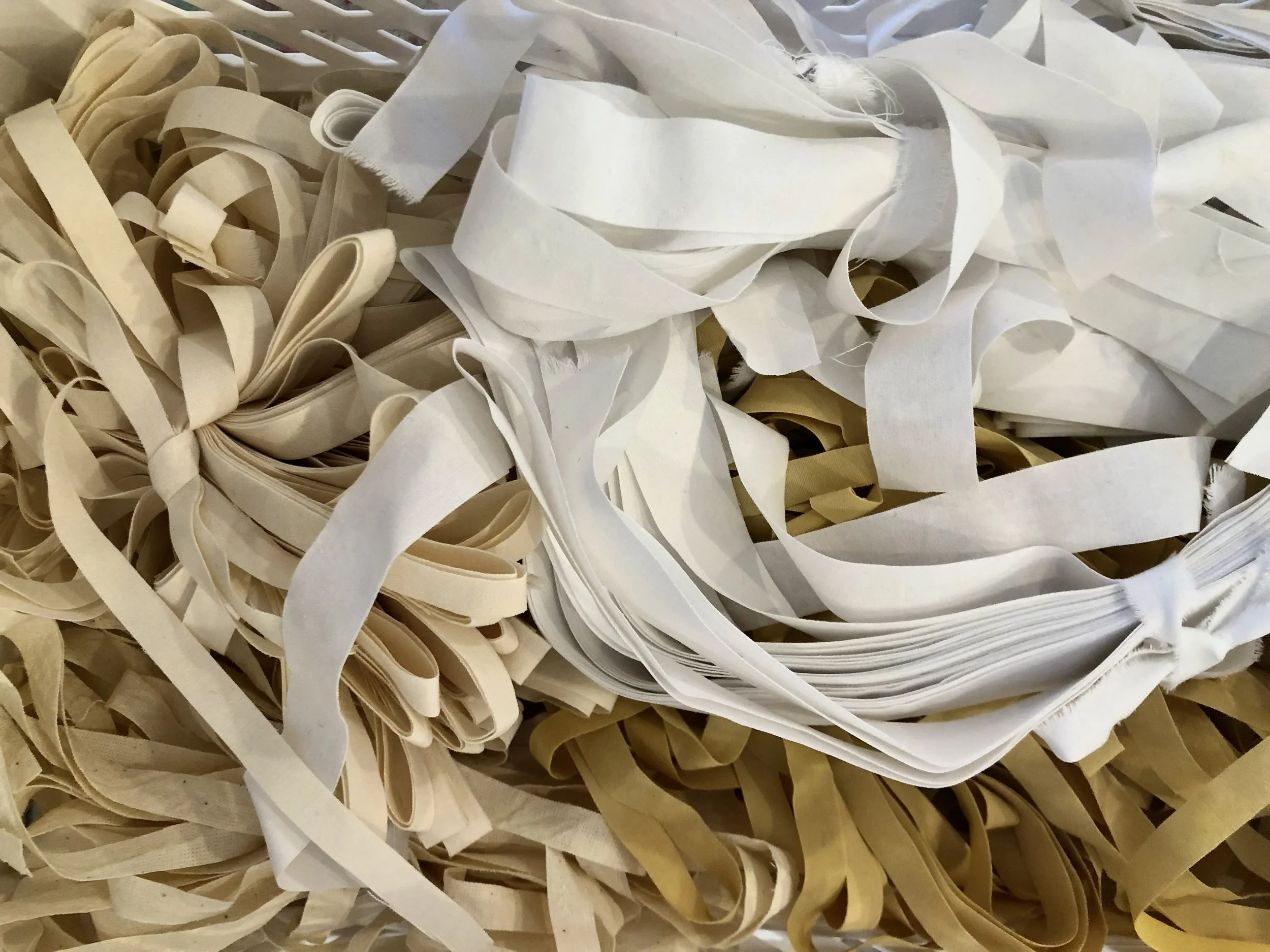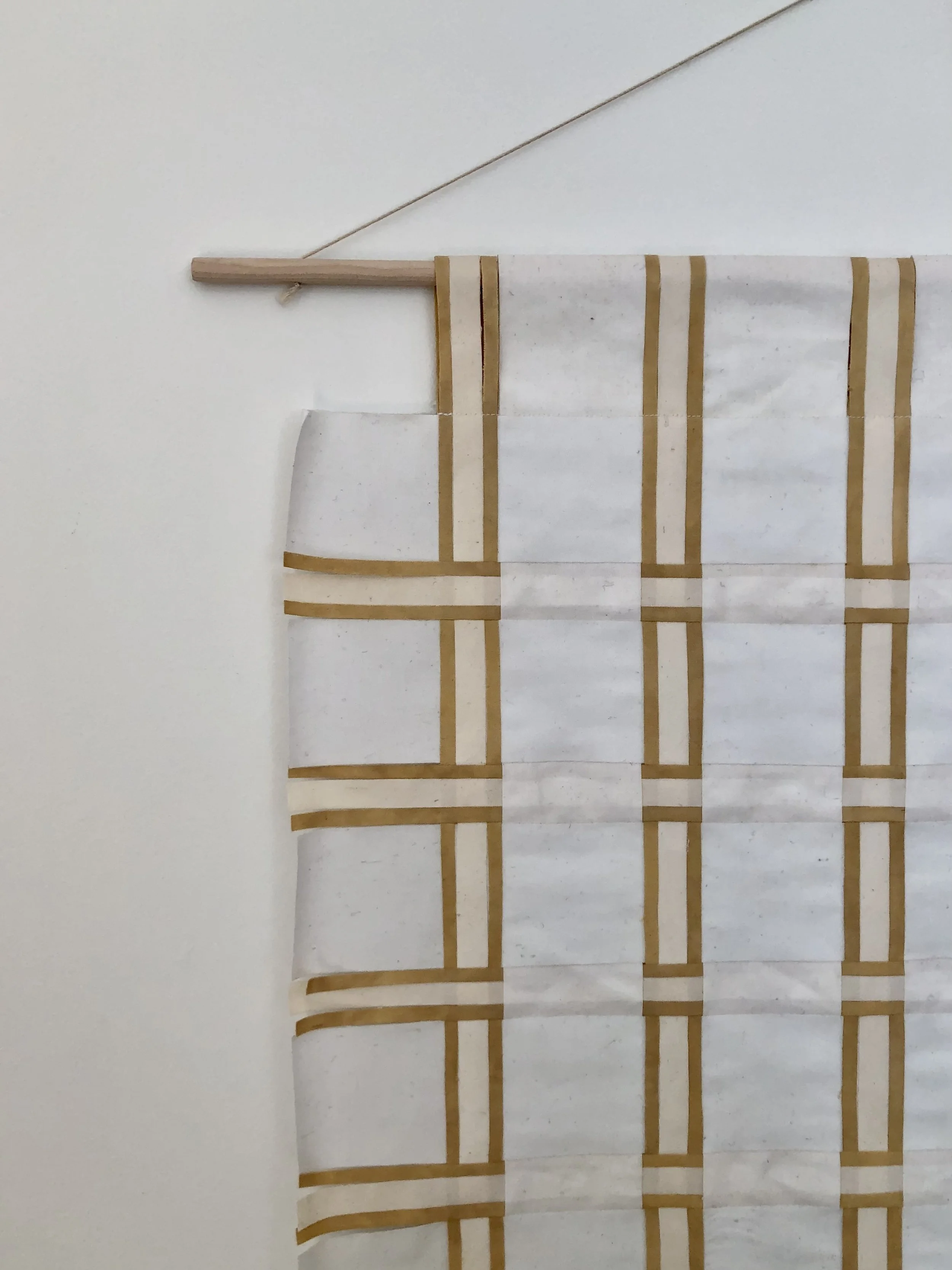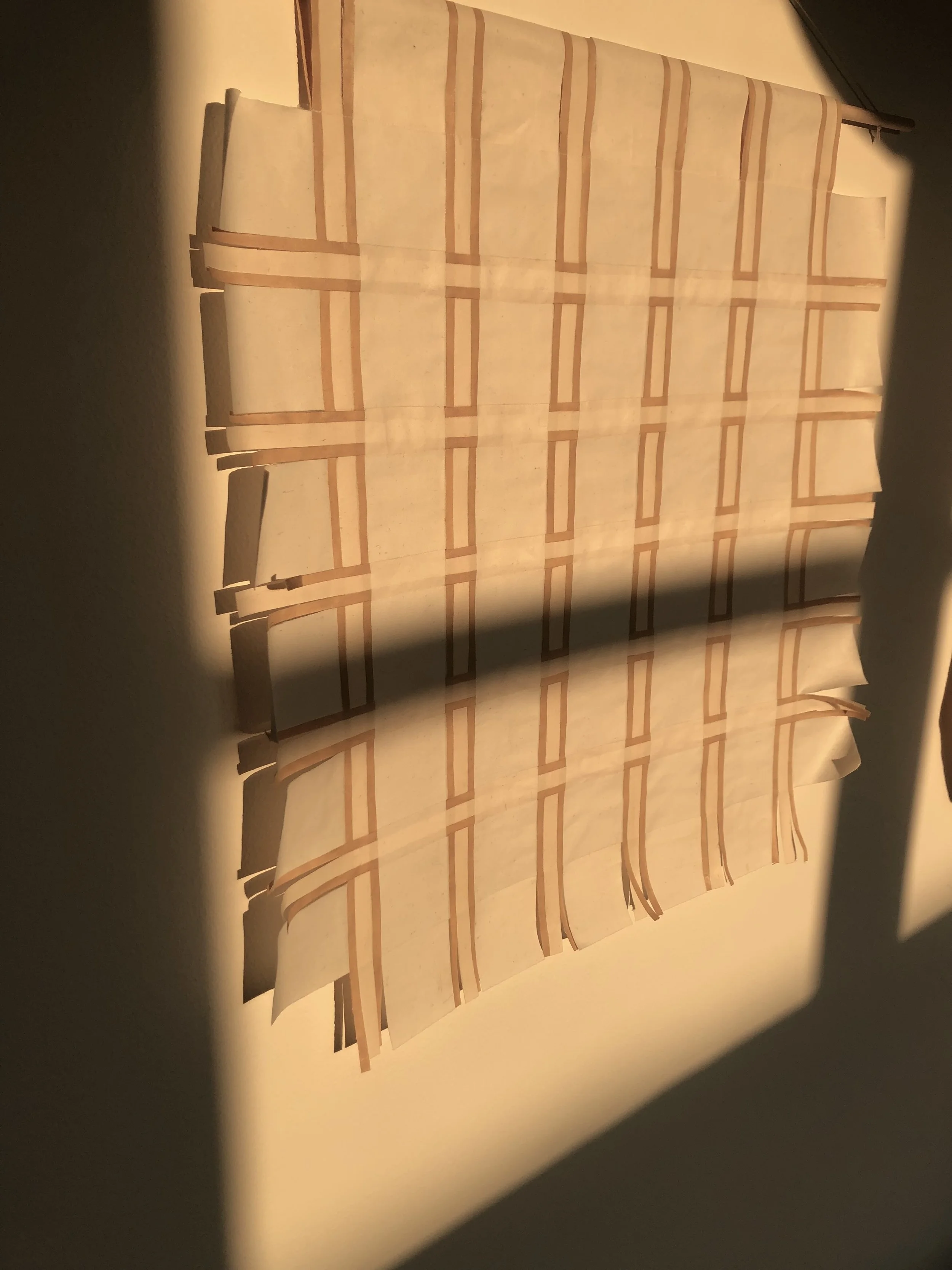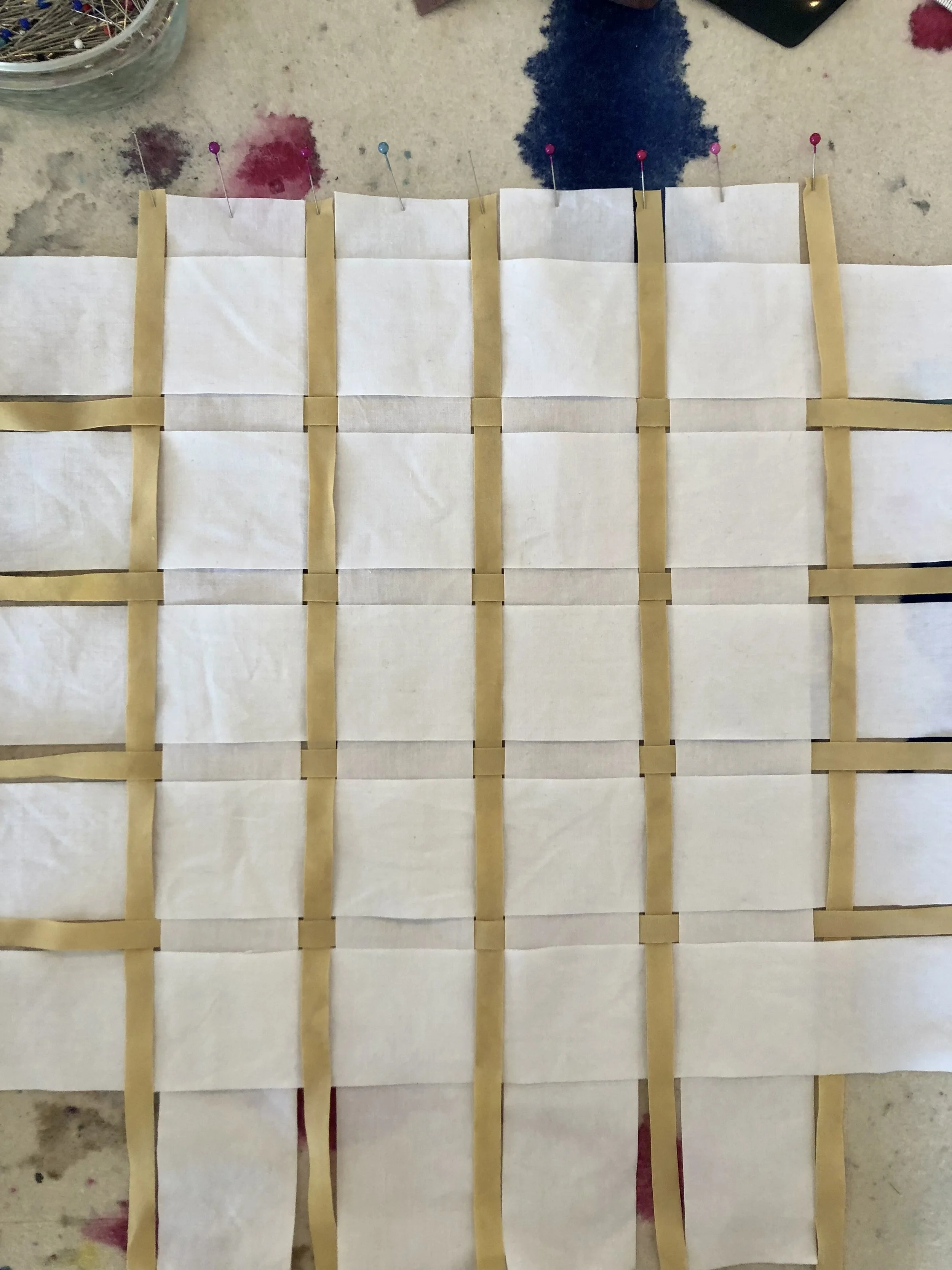 TATAMI (og LILLIE TATAMI) blev til i en leg med tekstile strimler. En del af processen med at skabe fletværkerne har været at undersøge forskellige flette/væve mønstre, og hvordan farverne og de varierende strimmel-tykkelser har harmoneret, påvirket og interageret med hinanden herigennem. Til at starte med var 1 cm den smalleste strimmel jeg arbejde med, men som TATAMI udviklede sig i mine hænder, måtte jeg halvere den mørke, varme karryfarve, fremskabt fra gule løgskaller, som jeg havde indfarvet det hvide tekstil med, for at få det udtryk frem, som begyndte at vise sig, og som mindende mig om gulvene i japanske huse belagt med smukke tatami måtter i enkle, grafiske mønstre.
