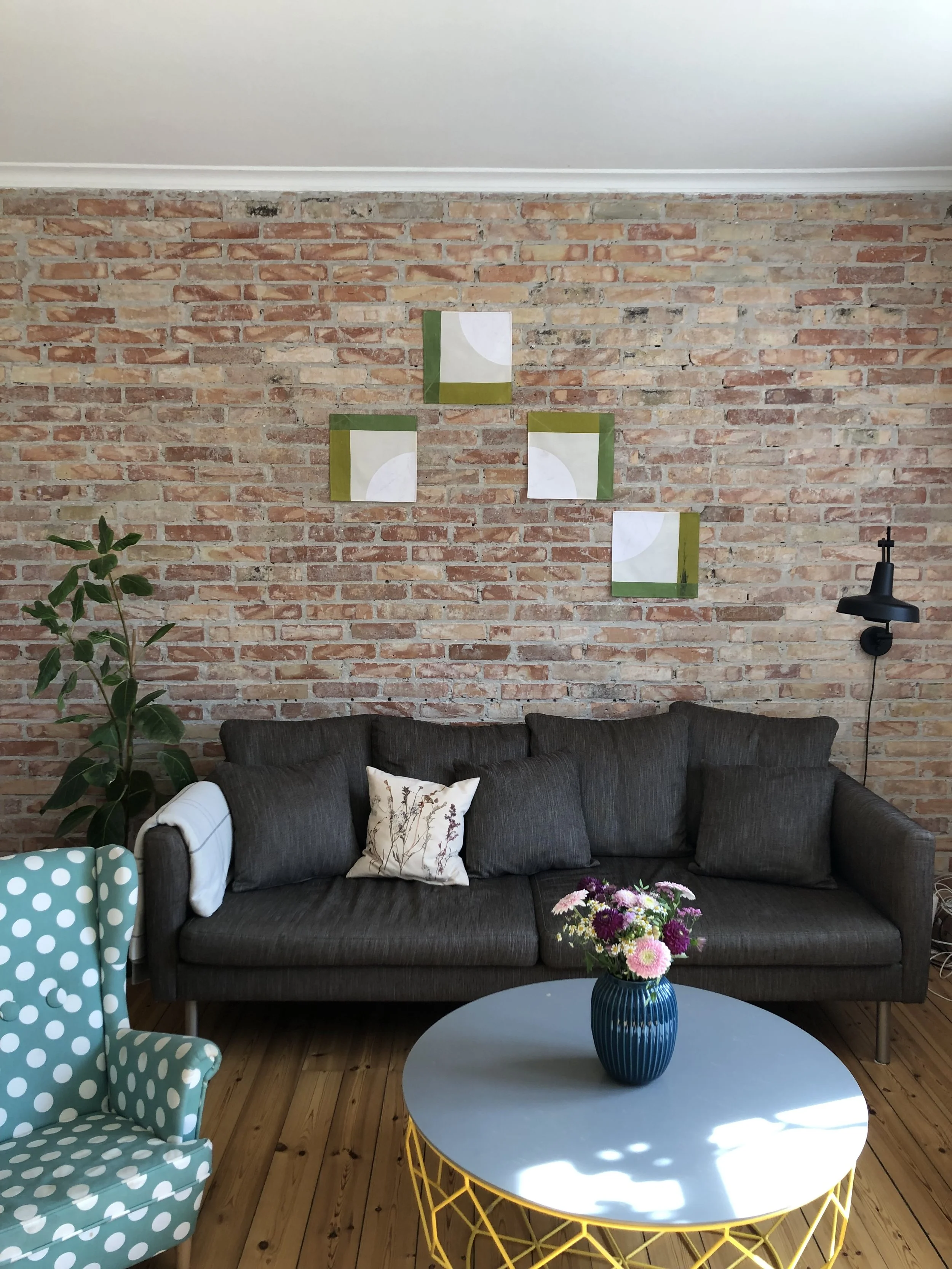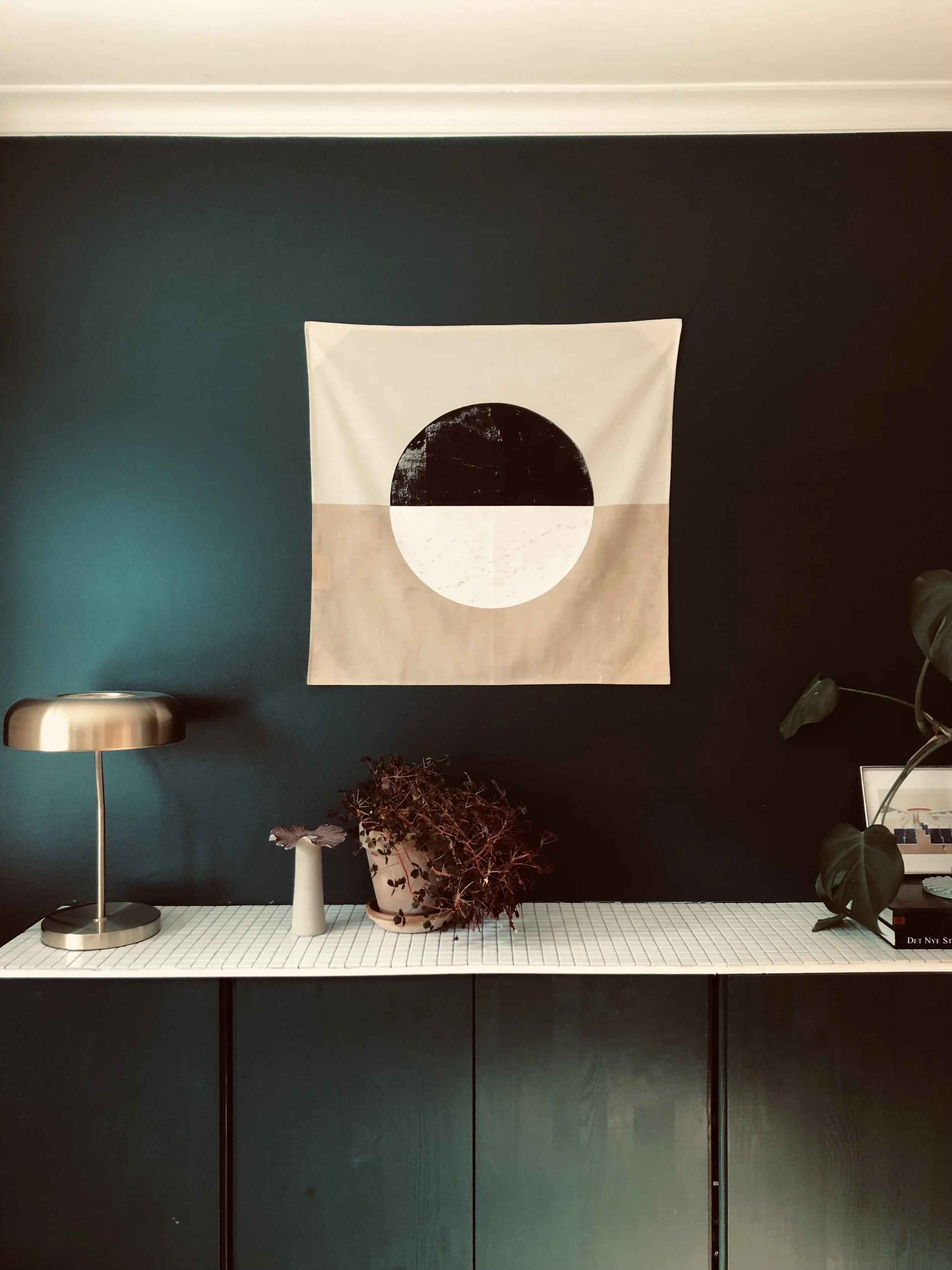MÅNESOL er resultatet af et vaskeægte costum-made-samarbejds-eventyr. Værket er nemlig blevet lavet i samarbejde med Sille fra spiseriet Patio 34 i Helsingør. Sille skrev til mig og spurgte om jeg lavede værker på bestilling efter ønske af farver. Hun var på udkig efter et værk til deres café, som de var i gang med at indrette i en japansk inspireret stil. Det var SOL I FARVER hun var faldet over, men hun ønskede en mere dæmpet farvepalette i jordnære nuancer som beige, brun, sort og hvid. Efter udveksling af farveinspiration og moodboard-fotos, en farvedesignproces og forskellige prøver og prototyper landede vi på det helt rigtige udtryk og de rette farve nuancer, som Sille ønskede og værket blev færdiggjort og leveret til Sille, hendes mand og deres smukke spiseri.